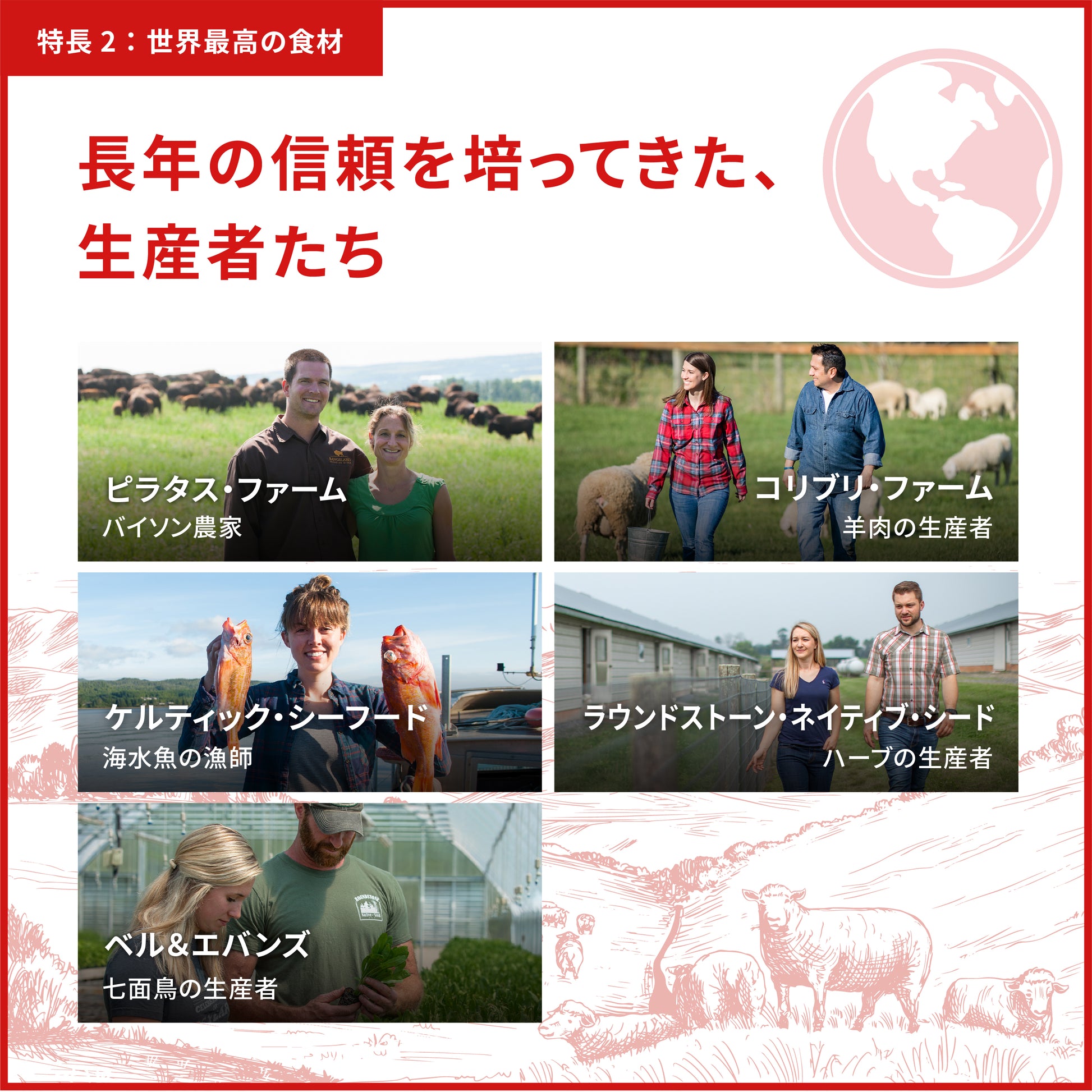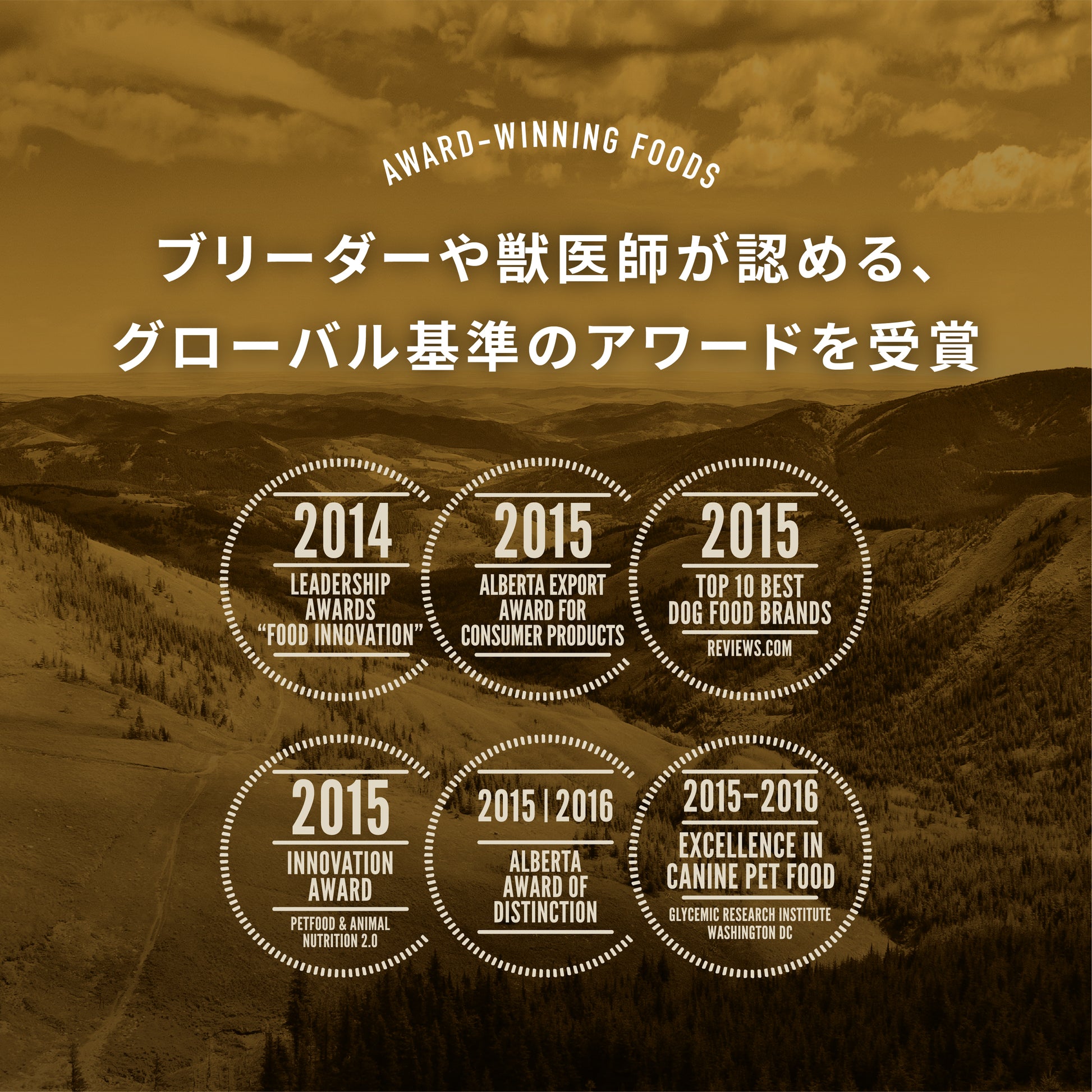 | 素材 | 生サーモン (22%), ニシンミール (19%), 精白大麦, 丸ごとエンドウ豆, オートグローツ, 豚脂肪 (8%), 丸ごとオーツ麦, ヒヨコ豆繊維, フィッシュオイル (1%), 炭酸カルシウム, 塩化カリウム, 乾燥ケルプ, 塩, 乾燥チコリールート, 新鮮丸ごとカボチャ, 新鮮丸ごとバターナッツスクワッシュ, 新鮮丸ごとニンジン, 新鮮丸ごとリンゴ, 新鮮丸ごと洋梨, 新鮮丸ごとズッキーニ, 新鮮ケール, 新鮮ホウレン草, 新鮮カブラ菜, 新鮮ビートの葉, 丸ごとクランベリー, 丸ごとブルーベリー, 丸ごとサスカトゥーンベリー, ターメリック, オオアザミ, ゴボウ, ラベンダー, マシュマロルート, ローズヒップ 酸化防止剤: 1b306(i) 植物油から抽出したトコフェロール: 110mg, 1a330 クエン酸: 40mg, ローズマリーエキス: 75mg 添加栄養素 (1kgあたり): 3a890 塩化コリン (コリン): 350mg, 3a370 タウリン: 400mg, 3b612 (亜鉛: 80mg), 3b407 (銅: 11mg), 3a821 ビタミンB1: 100mg, 3a825i ビタミンB2: 20mg, 3a314 ナイアシン: 200mg, 3a841 D-パントテン酸カルシウム: 60mg, 3a831 ビタミンB6: 35mg, 3a316 葉酸: 7mg, 3a835 ビタミンB12: 0.2mg, 3a672a ビタミンA: 6000 IU, 3a671 ビタミンD3: 800 IU, 3a700 ビタミンE: 330 IU, 3a300 アスコルビン酸: 0.15mg 添加腸球菌: 4b1707 エンテロコッカスフェシウム菌 DSM 10663/NCIMB 10415: 1x10^9 CFU |