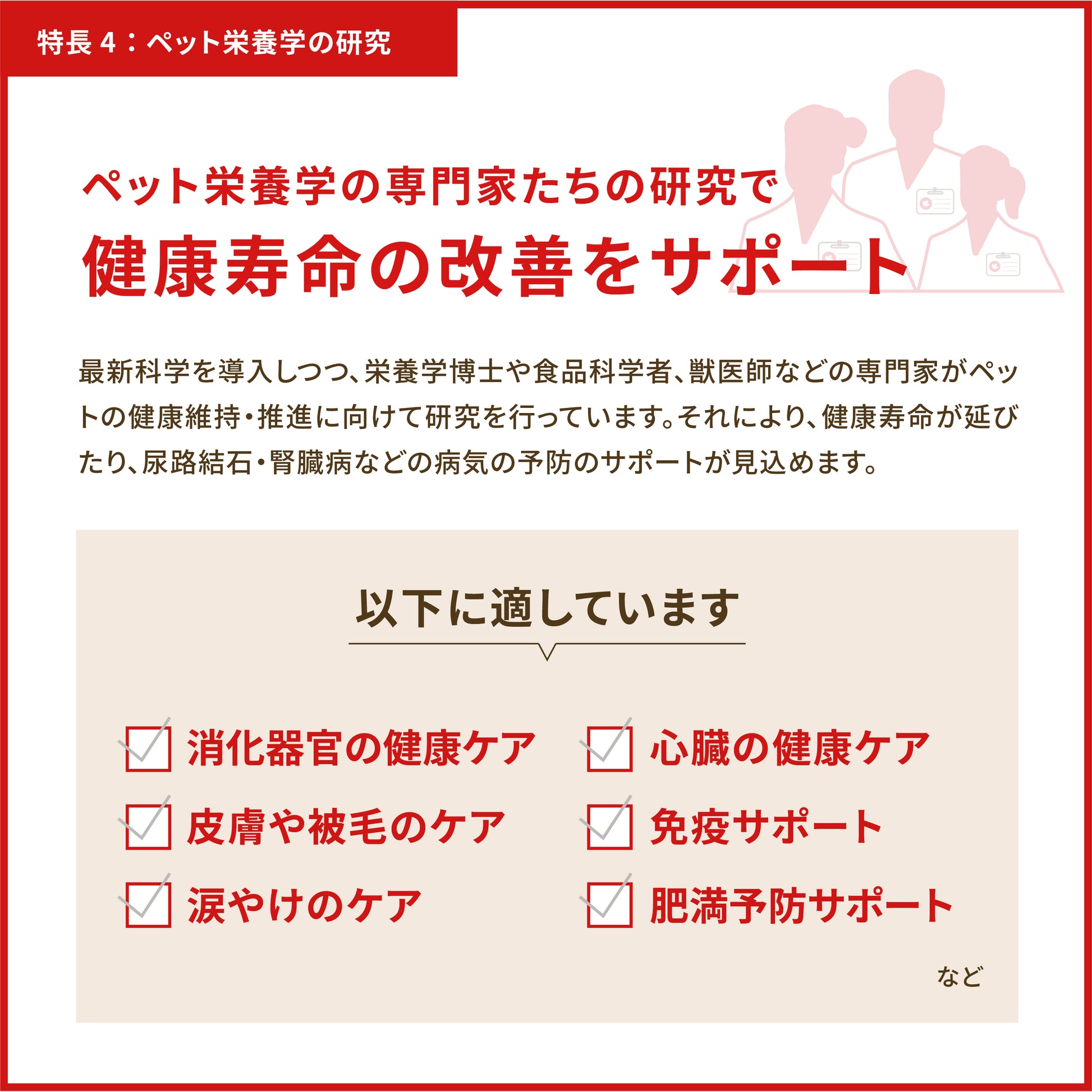 | 成分値 | タンパク質 27%以上、脂肪 16%以上、繊維 5%以下、灰分 7.5%以下、水分 12%以下、カルシウム/リン 1.2%以上/ 0.9%以上、オメガ6/オメガ3 2.6%以上/ 1.1%以上、DHA/EPA 0.4%以上/ 0.3%以上 |