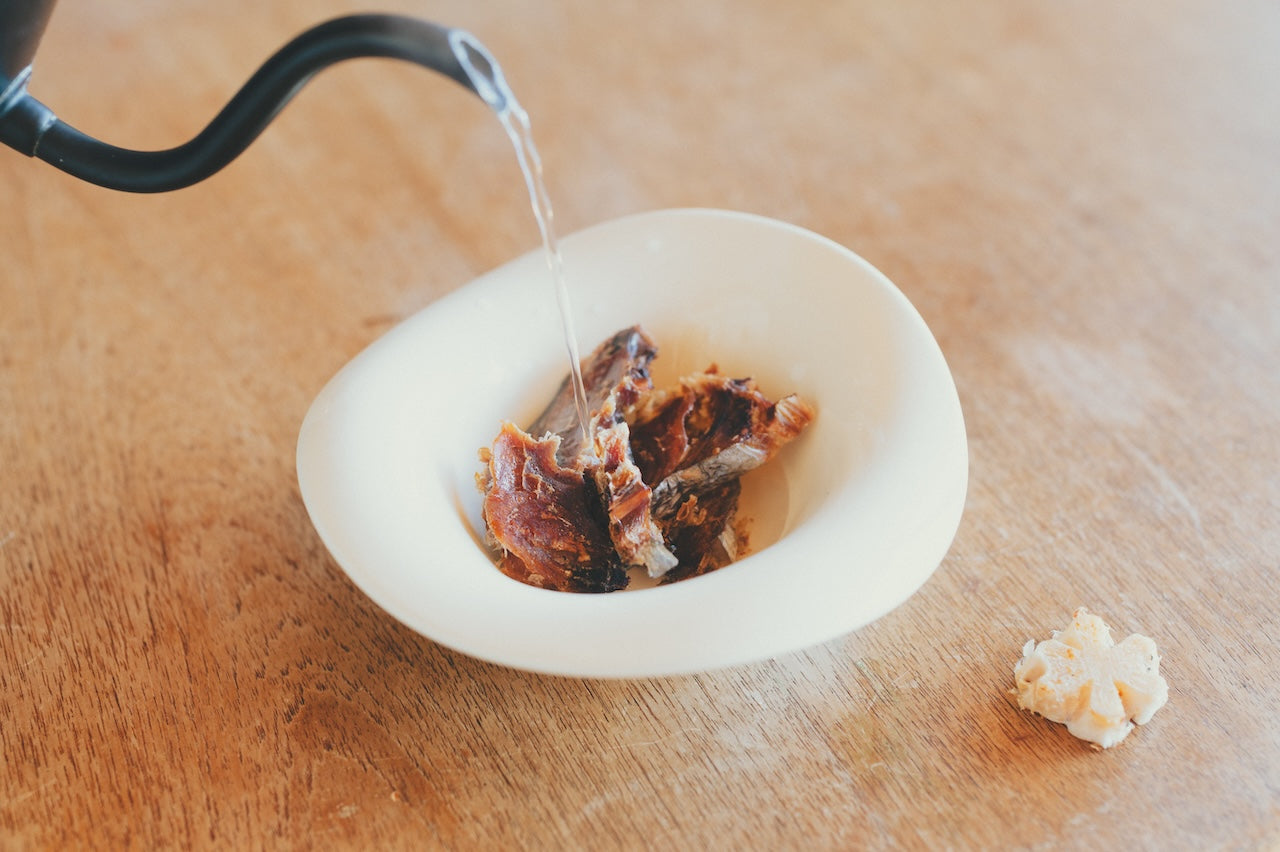まぐろの尾は回遊中によく動く部分。身が引き締まり、弾力のある食感と旨みが特徴。その尾の断面を、長時間じっくり加熱してジャーキーにしました。